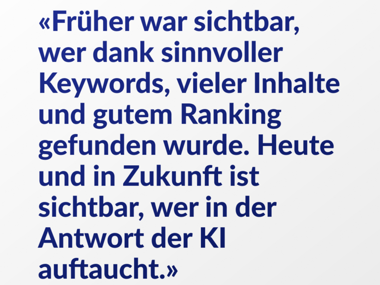Früher war sichtbar, wer dank sinnvoller Keywords, vieler Inhalte und gutem Ranking gefunden wurde. Heute und in Zukunft ist sichtbar, wer in der Antwort der KI auftaucht. Inhalte wirken damit langfristig. Sie werden von KI-Systemen gespeichert, kombiniert und in neuen Kontexten wiederverwendet. Unschärfen, Widersprüche oder überzogene Versprechen bleiben nicht folgenlos, sondern prägen das Bild eines Unternehmens über längere Zeit.
