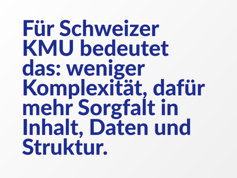 Für Schweizer KMU bedeutet das: weniger Komplexität, dafür mehr Sorgfalt in Inhalt, Daten und Struktur.