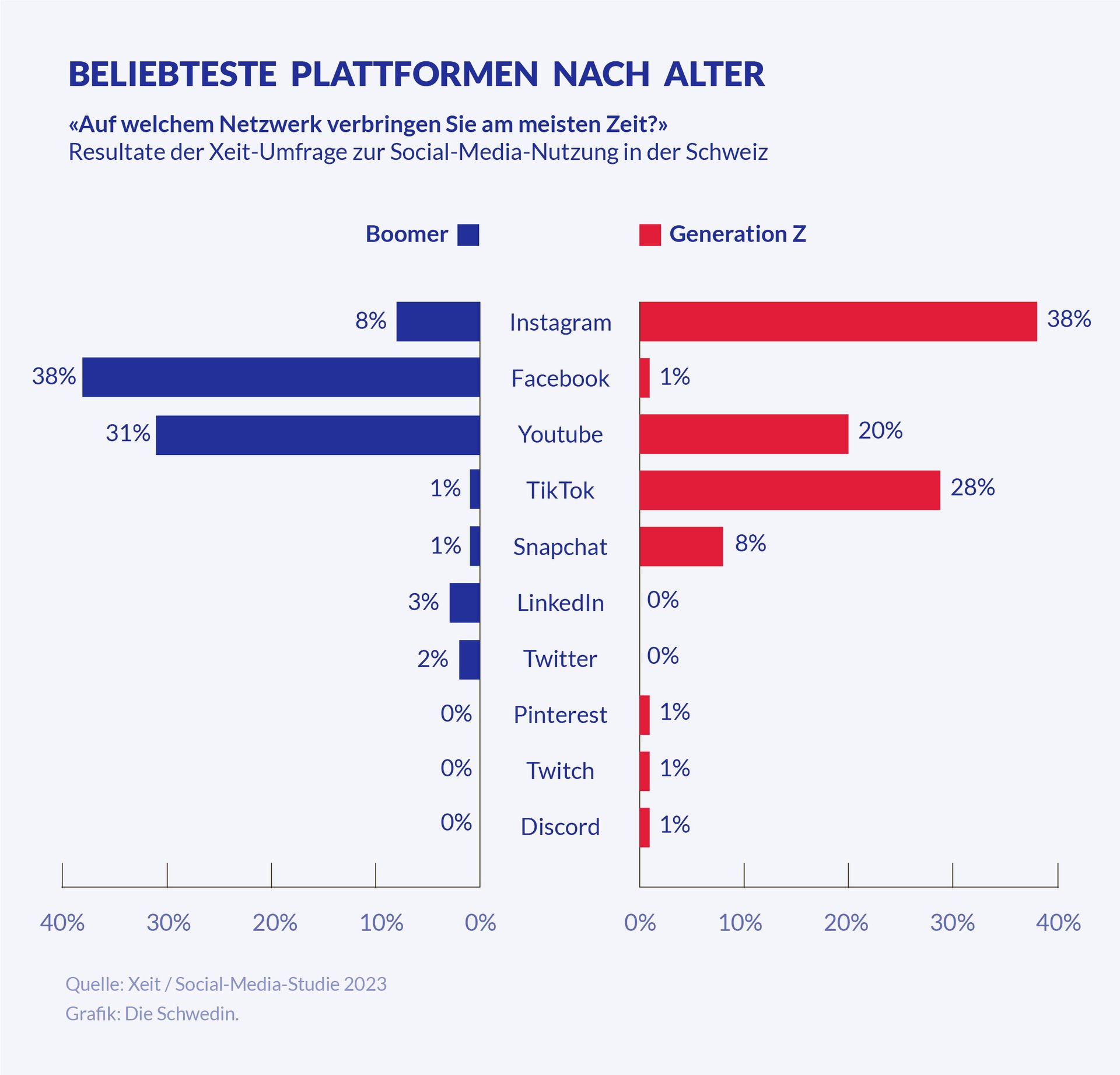 Einen neue Studie von Xeit zeigt, wie stark sich in der Schweiz die Generationen bei der Social-Media-Nutzung unterscheiden. Während fast 40 Prozent der Boomer (also Menschen, die zwischen 1946 und 1964 geboren sind) am meisten Zeit auf Facebook verbringen, nutzen nur 1 Prozent der Generation Z (Menschen, die zwischen 1990 und 2015 geboren sind) die Plattform häufiger als alle anderen. Die meistgenutzte Plattform in dieser Zielgruppe ist Instagram, noch vor TikTok.