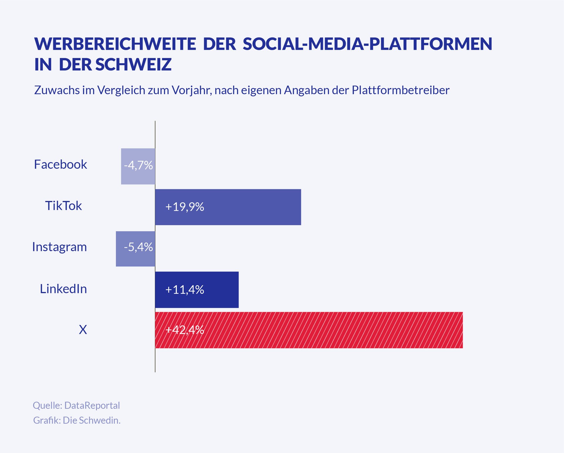 Der grösste Verlierer bei der Werbereichweite dürfte X sein. Zwar kommunizierte die Plattform letztes Jahr, dass ihre Werbebereichweite in der Schweiz um rund 42 Prozent steigen sollte. Eingetreten sein dürfte das allerdings nicht. Zwar weist X selbst keine aktuellen Zahlen aus, laut Statista verzeichnet die Plattform weltweit allerdings 14 Prozent weniger Besucher:innen als im Vorjahr.