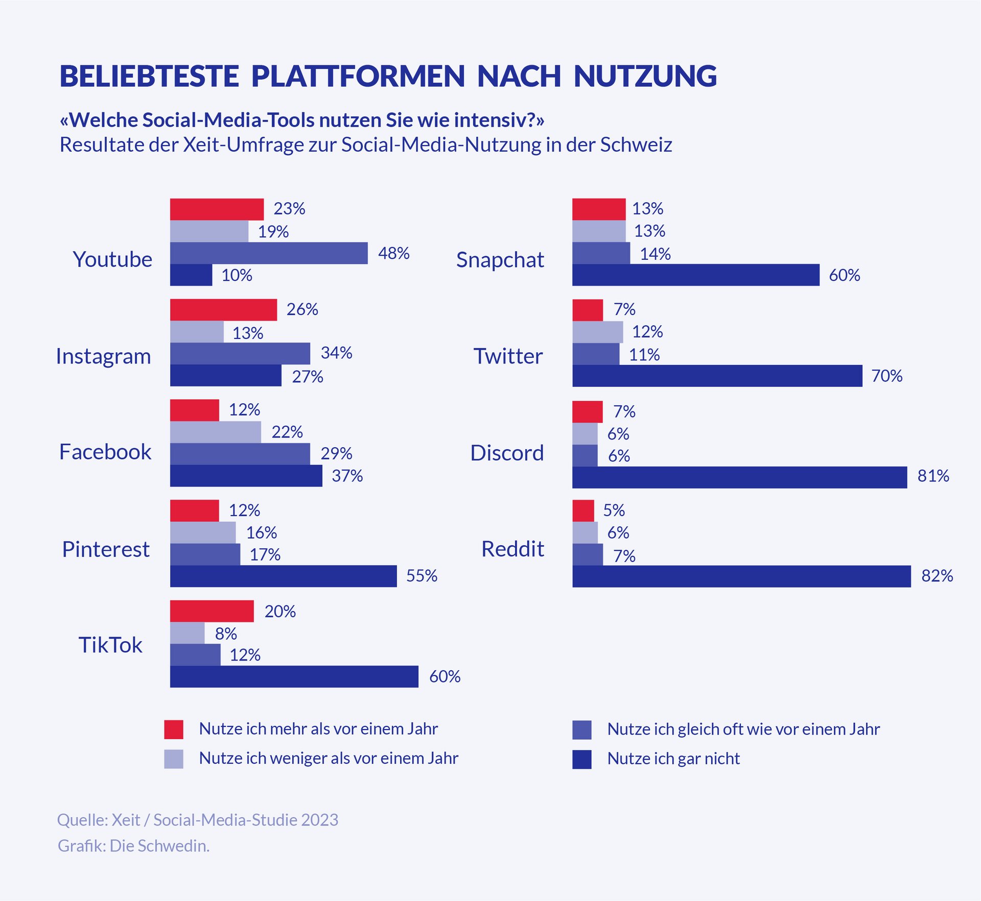 Die Nutzungszeit hat über das letzte Jahr hinweg vor allem bei Instagram und TikTok zugenommen, am stärksten gesunken ist sie bei Facebook. Trotz allem sind noch immer 63 Prozent der Schweizer:innen zumindest gelegentlich auf Facebook anzutreffen. Und erstaunlicherweise sind fast die Hälfte der aktiven Nutzer:innen zwischen 24 und 44 Jahre alt, während nur ein Drittel über 45 Lenze zählt. Facebook liegt in puncto Nutzung in der Schweiz auf Platz drei hinter Youtube1 (90 Prozent) und Instagram (73 Prozent).