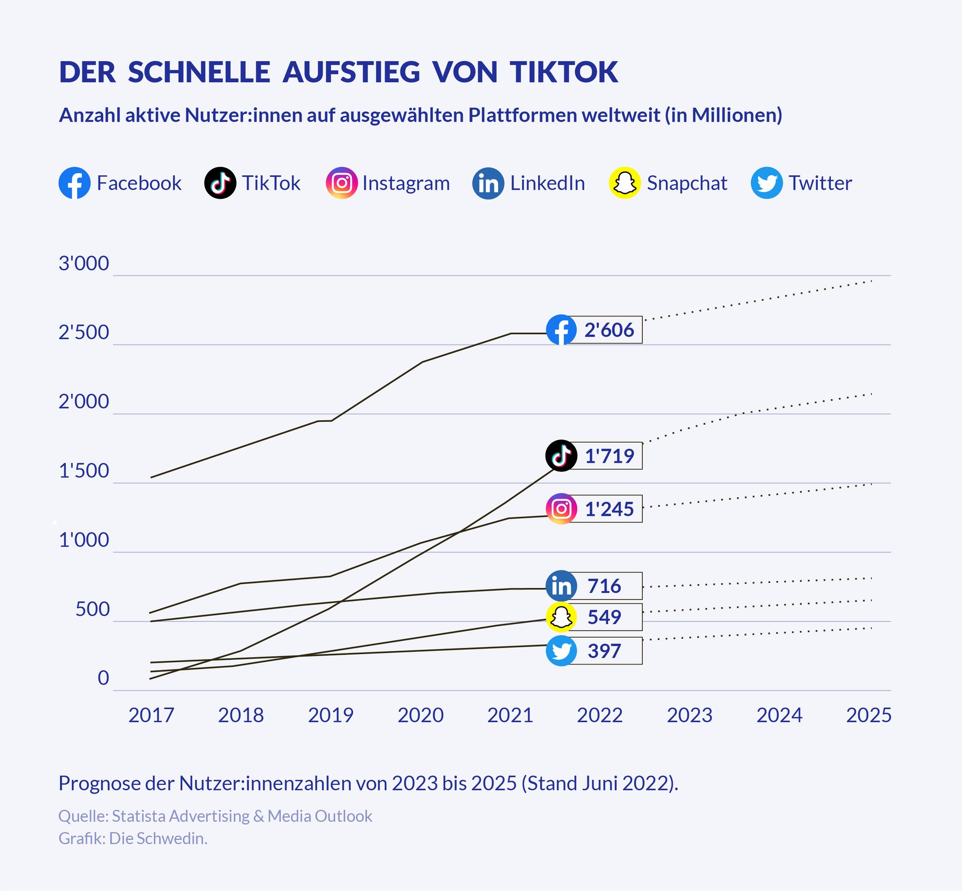 Gleichzeitig lassen sich die Nutzer:innen durchaus auch auf neue Dienste ein, wie der rasante Aufstieg von TikTok zeigt: Zwischen 2018 und 2022 konnte die Video-Sharing-Plattform durchschnittlich 340 Millionen neue aktive Mitglieder pro Jahr gewinnen. Im «digitalen Boom» der Covid-Pandemie überholte TikTok 2021 Instagram bei der Anzahl der Nutzer:innen. Damit hebt sich TikTok mit seiner aussergewöhnlichen Wachstumsrate von der Konkurrenz ab. Aktuell geht Statista jedoch davon aus, dass sich dieses Wachstum verlangsamen wird (weil zum Beispiel wieder eine neue Hype-Plattform auftauchen könnte) und die Nutzerbasis von TikTok «erst» im Jahr 2024 die 2 Milliarden-Grenze erreicht.