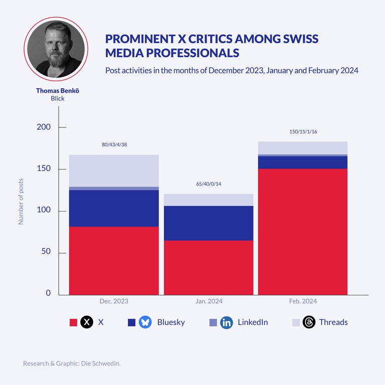 Tech journalist Thomas Benkö has also been actively involved in the discourse on possible X alternatives since the Musk takeover. He writes on his blog: "No matter what you think about Musk, as a journalist you still have to rely on Twitter: Especially when it comes to international topics, you find out a lot of things here first." Benkö posted significantly more on X in February and almost completely dispensed with Bluesky. He only used threads for a few private posts.