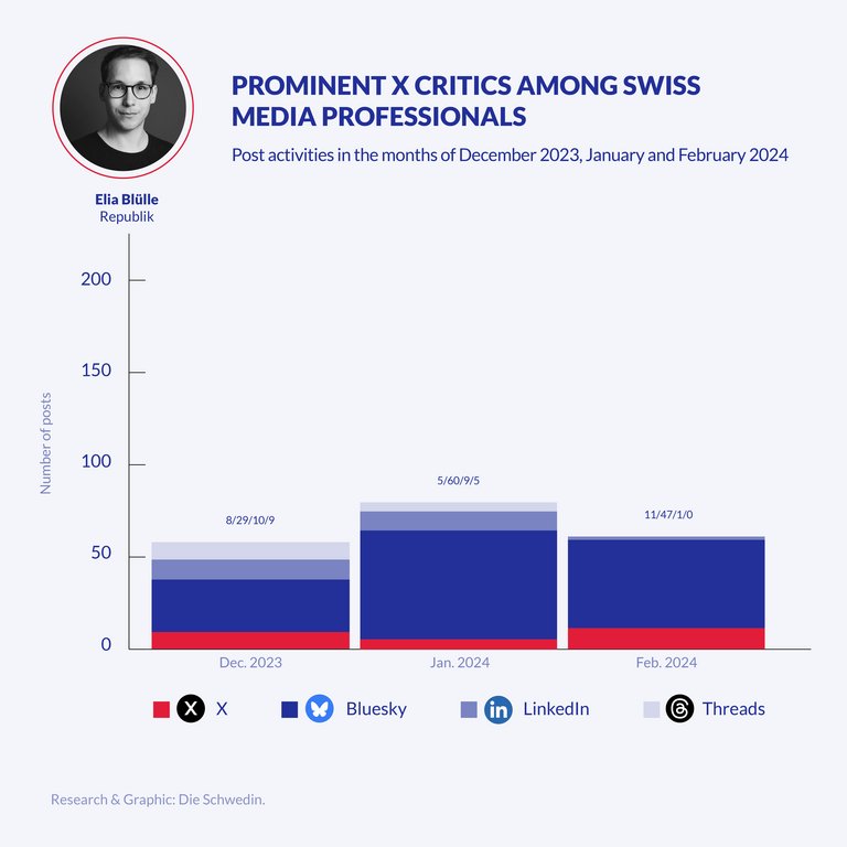 Elia Blülle from the Republic said goodbye to X in mid-December, but relented in January and published posts on the Musk platform again. Blülle is still more active on Bluesky, but posted significantly more on X again in February.