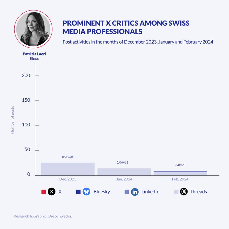 Patrizia Laeri, Elexx, left X in November and has been communicating mainly via threads ever since. However, there are fewer and fewer posts over time - in February there were only six posts.