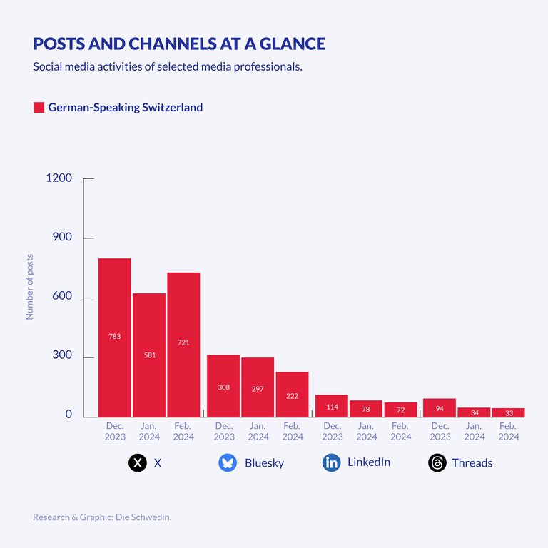 Threads and Bluesky are expanding globally, yet they're not widely recognized yet. Conversely, X is leveraging existing user habits but faces a drop in activity. In Switzerland, the situation is straightforward: X remains the dominant platform. Among media professionals, the newer platforms have hardly made an impact.