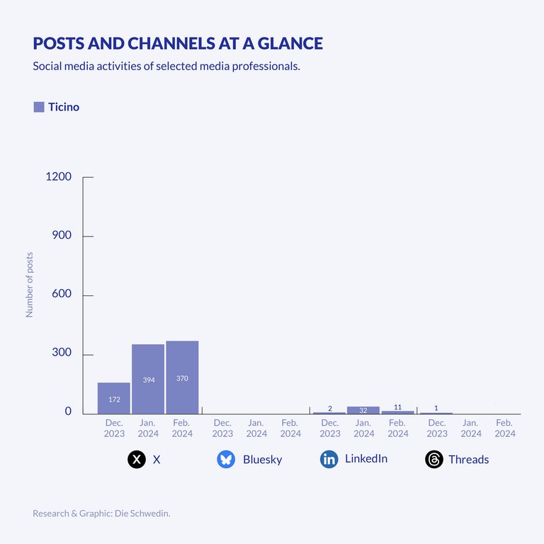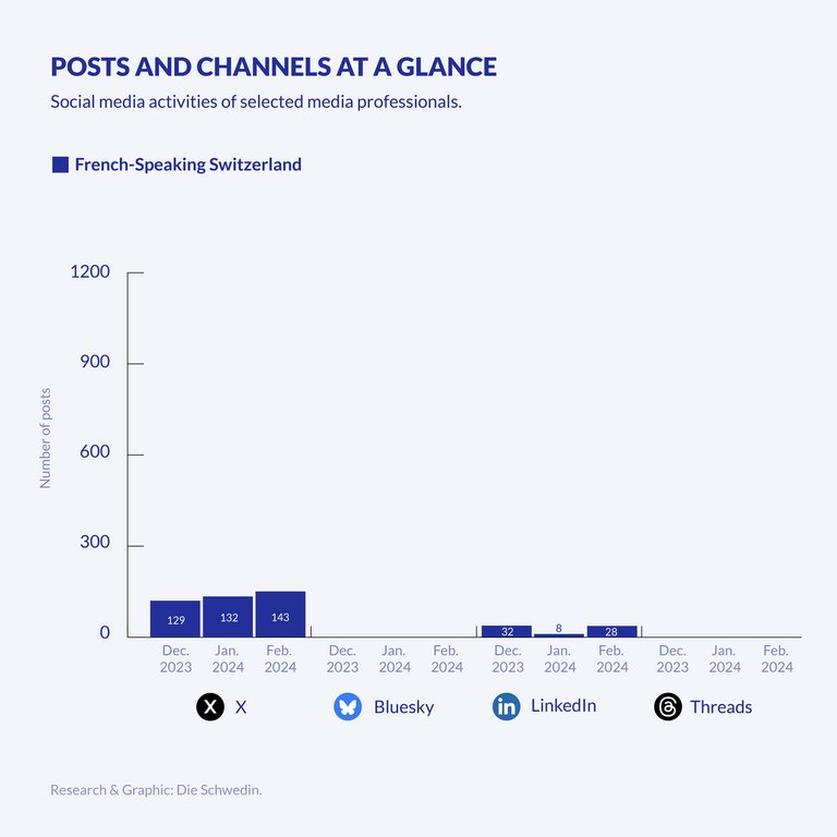 While all media professionals in both regions use X, LinkedIn only seems to be an issue in French-speaking Switzerland, where 5 out of 8 people are active. Nobody uses Bluesky or Threads. A total of 171 posts were published in French-speaking Switzerland, i.e. 7 posts more than in the previous month. In Ticino, there were 381 posts, i.e. 21 posts fewer than in the previous month.