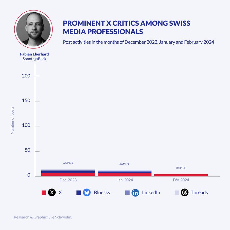 Fabian Eberhard, deputy editor-in-chief of SonntagsBlick, also wrote to us in response to our request: "Unfortunately, X is getting worse and worse, the algorithms are increasingly flushing right-wing hate accounts to the surface. Nevertheless, X remains the most pressing platform for me, both in terms of topicality and the presence of opinion leaders. The new players like Bluesky, Mastodon or Threads still can't replace X." Fabian has tried out the new platforms, but only used X in February.
