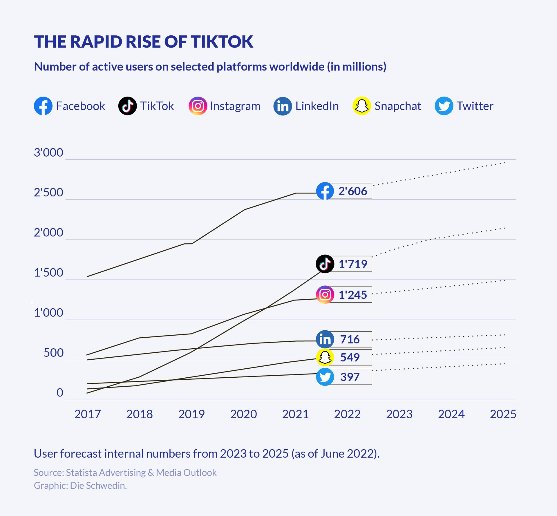 Global usage figures: TikTok is growing rapidly, and Facebook remains the largest platform