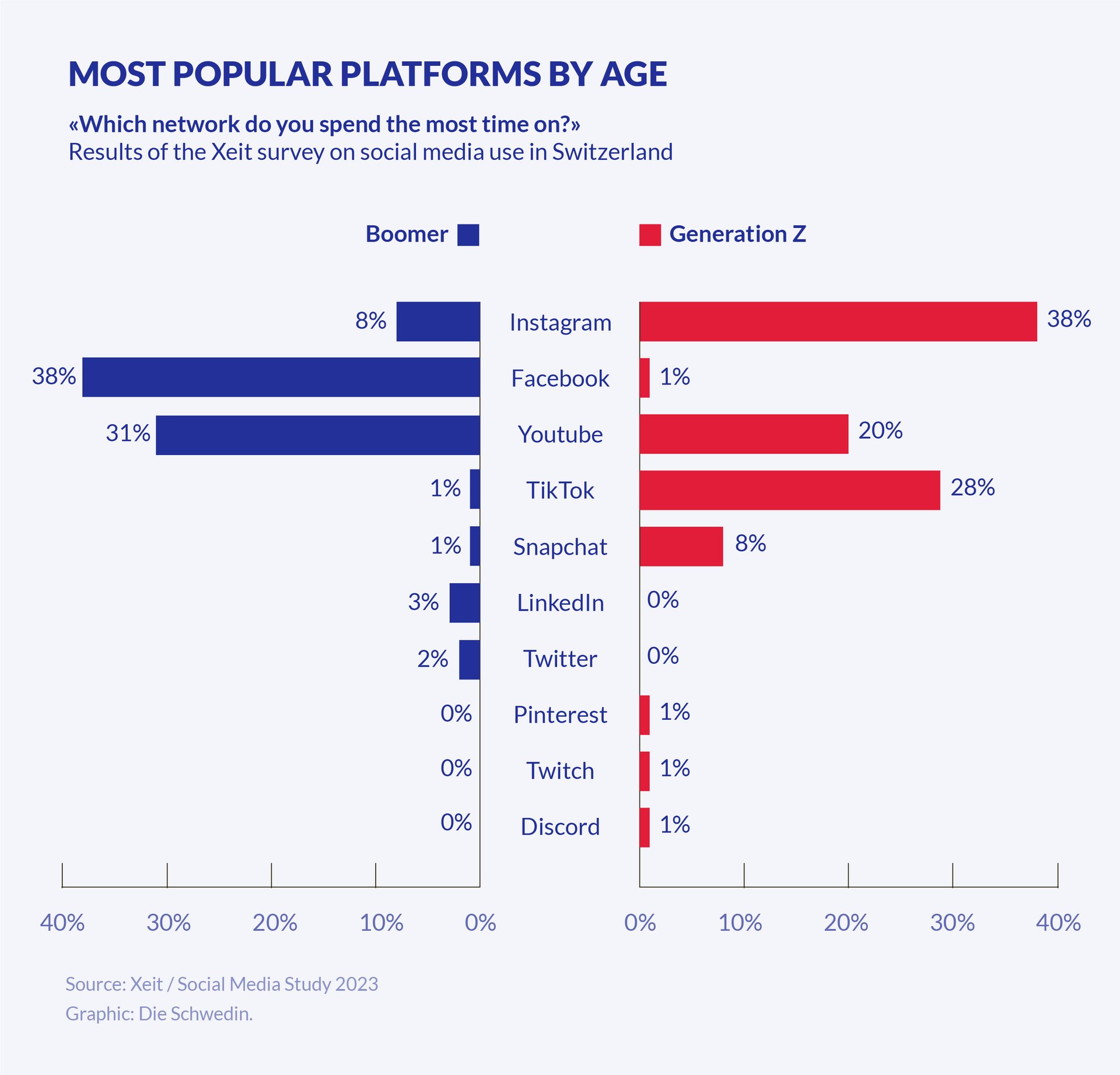 A new study by Xeit shows how different generations in Switzerland use social media. While nearly 40% of boomers (people born between 1946 and 1964) spend the most time on Facebook, only 1% of Gen Z (born between 1990 and 2015) use the platform more often than any other. The most-used platform for this audience is Instagram, ahead of TikTok.