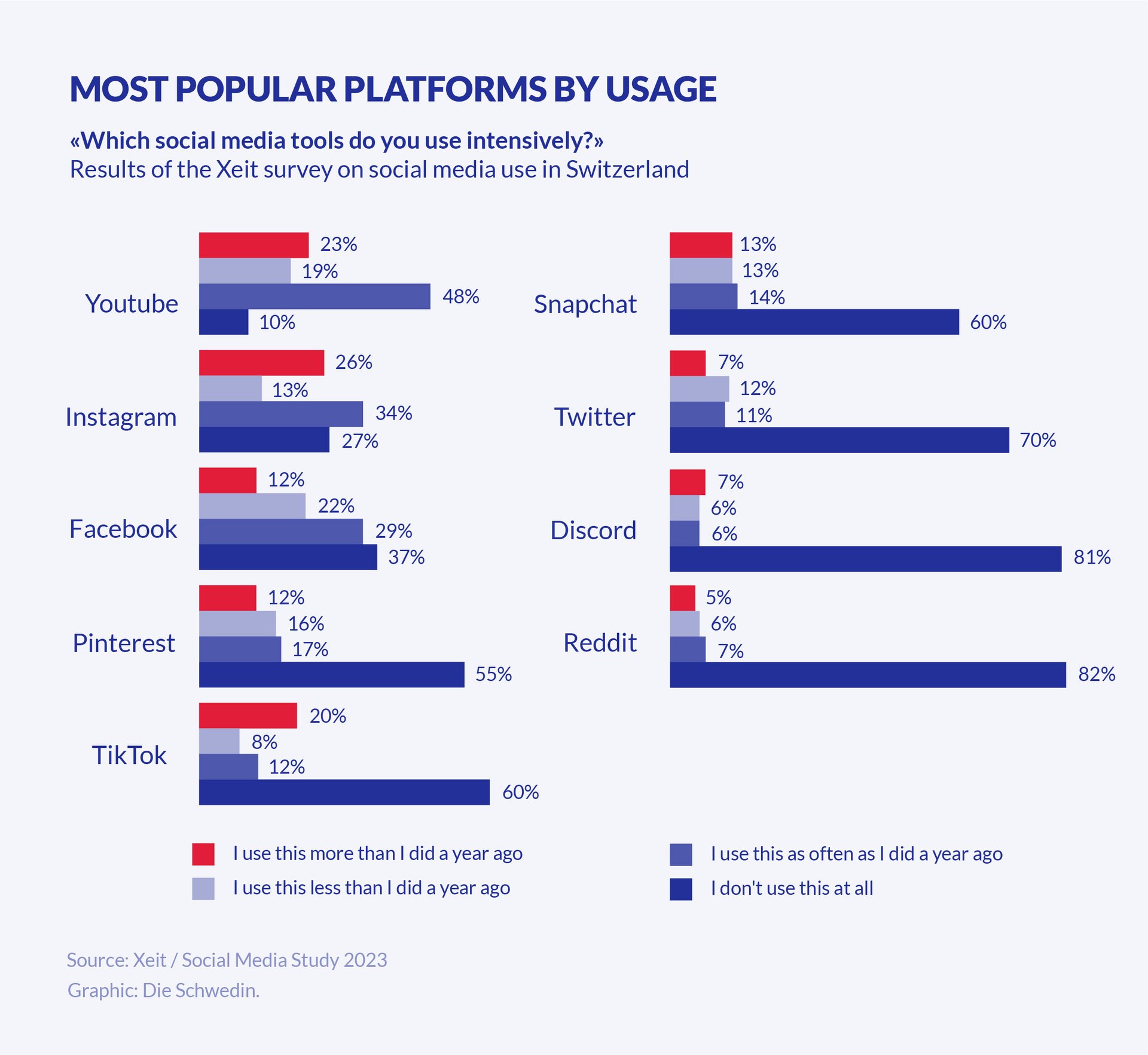 When we eliminate X, TikTok is the clear winner with the highest percentage of revenue growth. App developer ByteDance reported that TikTok's advertising reach in Switzerland grew by almost 20% (341,000 people) from 2022 to 2023 – a figure in line with anecdotal opinion. Most TikTok users: