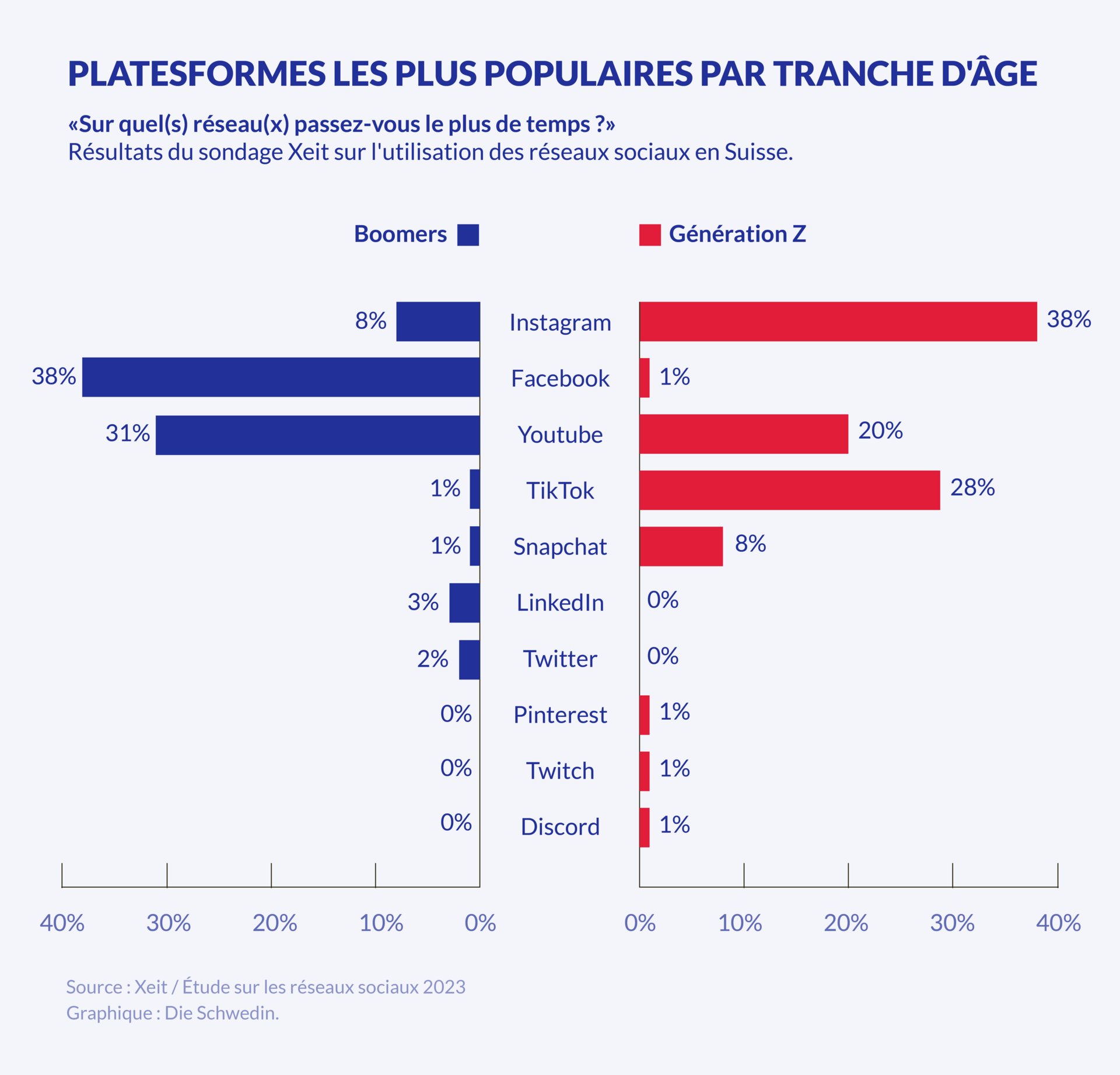 Une nouvelle étude de Xeit montre à quel point les générations présentent des divergences dans leur utilisation des réseaux sociaux en Suisse. Alors que près de 40% des boomers (c'est-à-dire les personnes nées entre 1946 et 1964) passent le plus de temps sur Facebook, seul 1% de la génération Z (personnes nées entre 1990 et 2015) l’utilise majoritairement. La plateforme la plus consultée par ce groupe cible est Instagram, devant TikTok.
