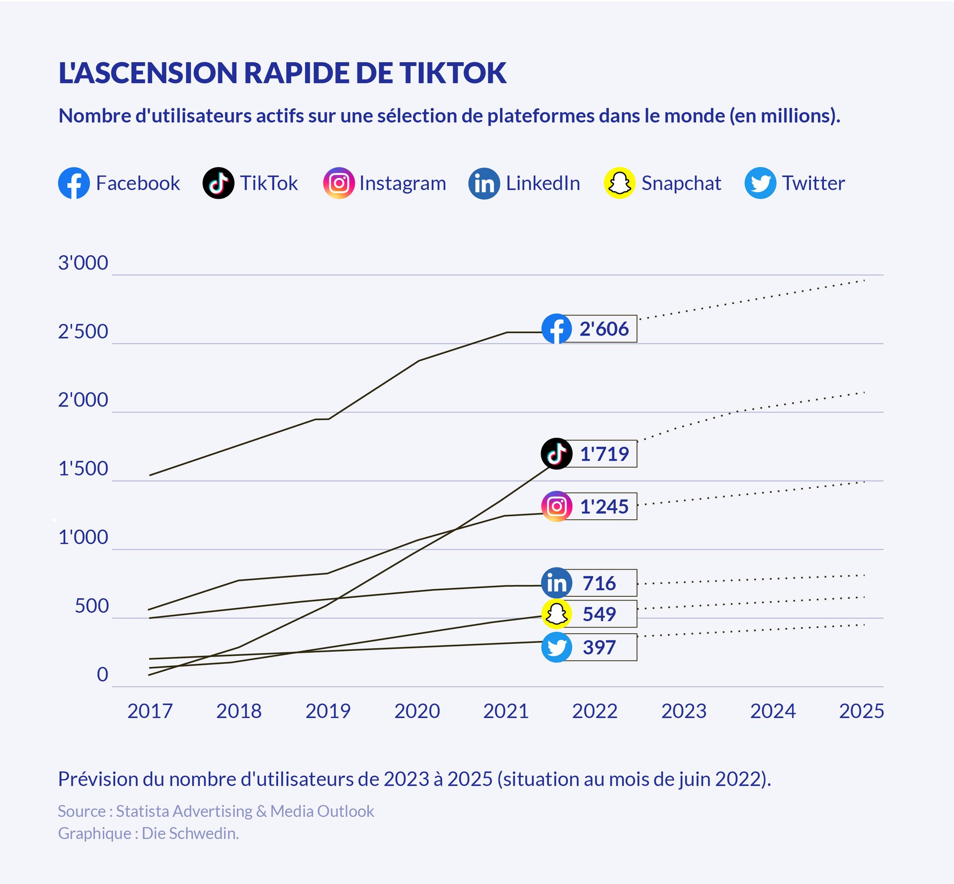 Parallèlement, les utilisateurs se laissent également séduire par de nouveaux services, comme le montre l'ascension fulgurante de TikTok: Entre 2018 et 2022, la plateforme de partage de vidéos a gagné en moyenne 340 millions de nouveaux membres actifs par an. Lors du «boom» numérique survenu pendant la pandémie de Covid, TikTok a dépassé Instagram en 2021 en termes de nombre d'utilisateurs/trices. TikTok se distingue ainsi de la concurrence par son taux de croissance exceptionnel. Toutefois, Statista part actuellement du principe que cette croissance devrait ralentir (l’arrivée de nouvelles plateformes pourraient jouer les trouble-fête) et que la base d'utilisateurs de TikTok n'atteindra la barre des 2 milliards «qu'en 2024».