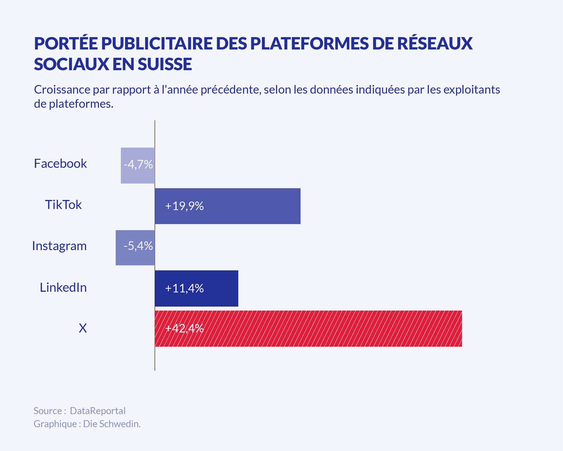 Le plus grand perdant en matière d'audience publicitaire devrait être X. Si la plateforme a annoncé l'année dernière4 que sa portée publicitaire en Suisse devrait augmenter d'environ 42%, il n'en est rien. Bien que X ne présente pas de chiffres actuels, la plateforme enregistrerait, selon Statista, 14% de visites en moins que l'année dernière.5