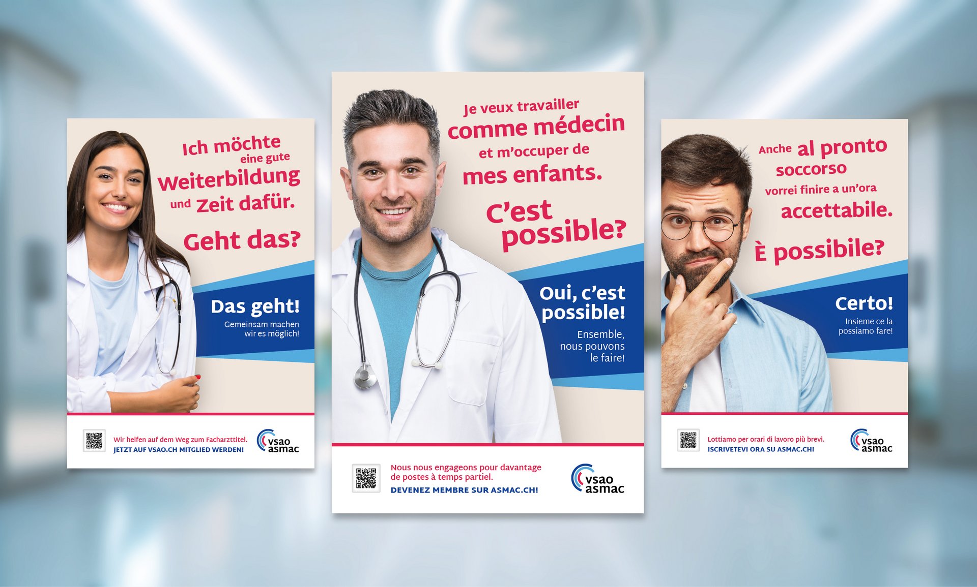 Comment atteindre un groupe cible qui travaille beaucoup et passe peu de temps sur les réseaux sociaux? C'était l'une des questions clés de cette campagne. L'équipe de Die Schwedin. connaissait la réponse, grâce aux projets que nous avions déjà réalisés avec la section bernoise de l'asmac. La décision a donc été prise d'adopter une approche cross-média: nous avons conçu une campagne d'affichage dans toute la Suisse, avec des placements à des points stratégiques, comme la gare centrale de Zürich, aux arrêts de transports publics devant les hôpitaux, ainsi que des flyers dans les cliniques. Parallèlement, nous avons diffusé plusieurs spots vidéo sur les réseaux sociaux avec des messages reflétant les thèmes clés de l'association et incitant le public-cible à rejoindre l’asmac. La seconde vague de la campagne a mis l'accent sur de la conversion, invitant activement les médecins à devenir membres. Toutes ces opérations ont été menées dans toutes les régions du pays, en allemand, en italien et en français.